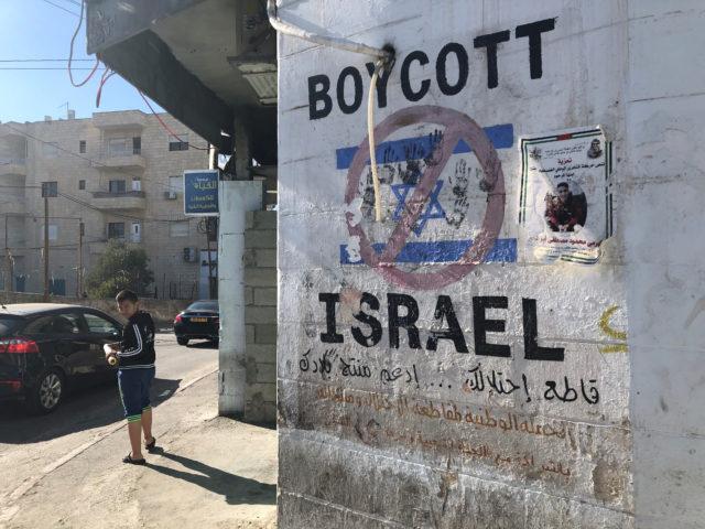 FILE PHOTO: A Palestinian boy looks on near a graffiti boycotting Israel in Bethlehem, in the Israeli-occupied West Bank November 3, 2018. Picture taken on November 3, 2018. REUTERS/Stephen Farrell/File Photo