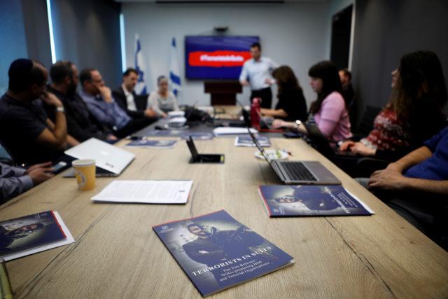 Israel’s Ministry of Strategic Affairs briefs reporters on alleged ties between militant groups and NGOs which support the Boycott, Divestment, Sanctions (BDS) movement, in Bnei Brak, near Tel Aviv, Israel, February 3, 2019. Picture taken February 3, 2019. REUTERS/Nir ELias