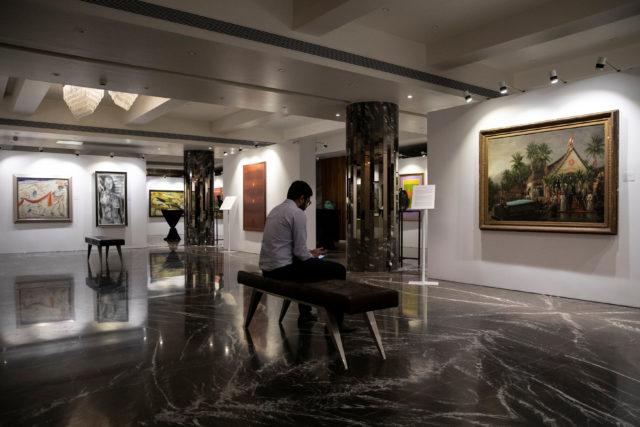 A staff member looks at his phone as artworks once part of billionaire jeweller Nirav Modi’s collection are seen on display ahead of their auction at a gallery in Mumbai, India, March 25, 2019. REUTERS/Danish Siddiqui