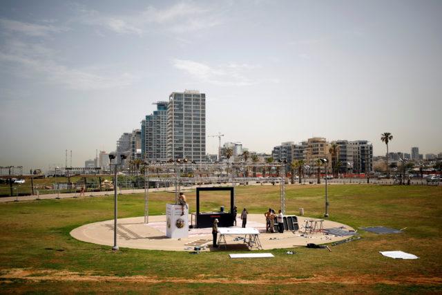 FILE PHOTO: Labourers work on the construction of the Eurovision Village, a space dedicated for fans of the upcoming Eurovision Song Contest, in Tel Aviv, Israel May 6, 2019. REUTERS/Corinna Kern/File Photo