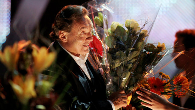 Czech pop singer Karel Gott receives flowers after a concert