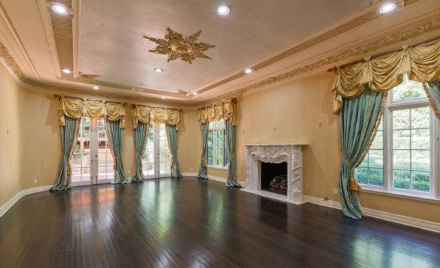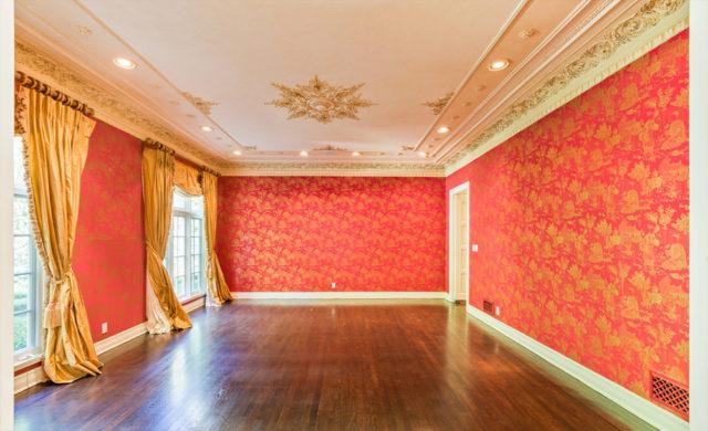 Almost as big as a hotel ballroom, the skylight topped double-height foyer features high-polished inlaid marble floors and leads to cavernous formal living and dining rooms, the latter wrapped in glimmering, Chinoiserie-style red and gold wallpaper.