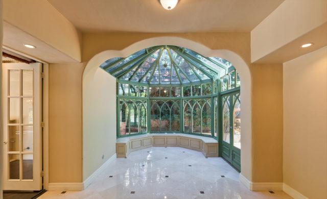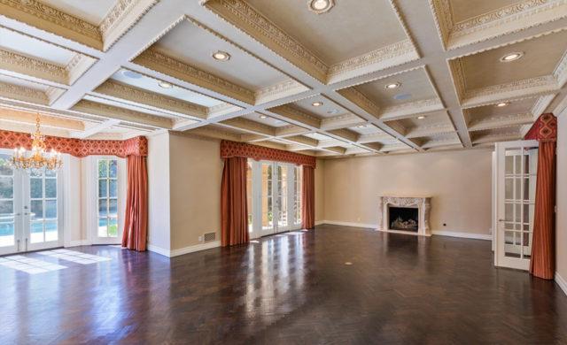 KimoraLeeSimmons_BHLse9An unusually windowless, mahogany paneled library/office opens to a beige marble-floored winter garden; A vast family room with dark-stained herringbone pattern hardwood flooring spills out to the swimming pool through full-height French doors; And the kitchen, fitted at tremendous expense with premium-grade appliances and elaborately carved and embellished bespoke cabinetry, adjoins an octagonal breakfast room with floor-to-ceiling French doors and built-in media equipment set into a carved wood cabinet.