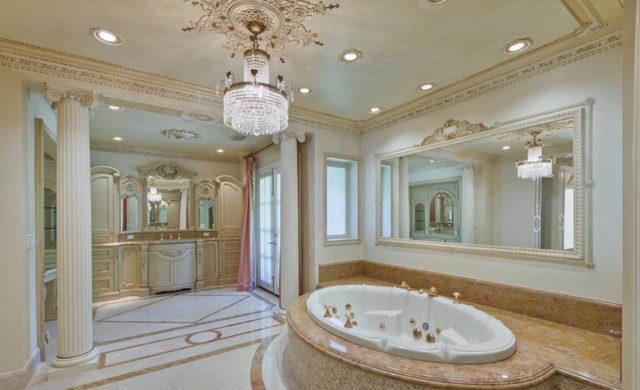 There are two bedrooms and bathrooms on the main floor for staff and/or guests plus five more guest and family bedrooms on the second level along with a roomy master suite replete with French doors to a private terrace, a mirror-lined corridor between two extravagantly fitted dressing rooms and a super-luxe bathroom so garishly lavish even Marie Antoinette might feel perfectly at home.