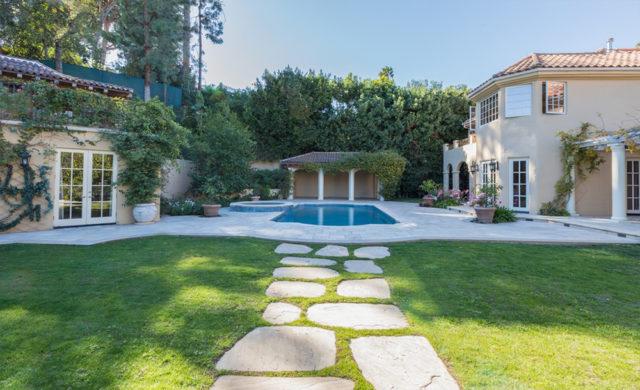 KimoraLeeSimmons_BHLse3Between the main house and guesthouse, atop of which there’s a partly sheltered terrace, a swimming pool and spa sits next to a vine draped open-air pavilion while a broad set of stone steps leads down to verdant and grassy if not exactly meticulously groomed formal gardens planted where there was once a tennis court.