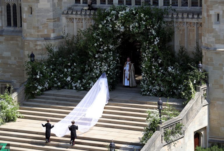 Meghan’s long veil, made of silk tulle, was decorated with a trim of hand-embroidered flowers in silk threads and organza, the palace said, and paid tribute to the 53 countries of the Commonwealth.