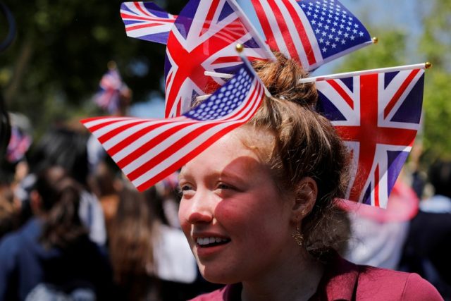 A student at Meghan Markle’s former Los Angeles high school wears British and American flags she takes part in a ‘Here’s to Meghan!’ celebration ahead of her marriage to Prince Harry, as they celebrate at Immaculate Heart High School in Los Angeles, California, U.S., May 15, 2018. REUTERS/Mike Blake