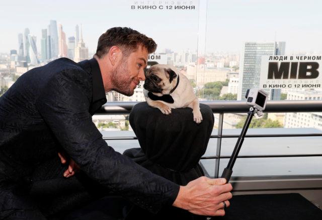 Chris Hemsworth poses for a selfie with a dog during a photocall for the film “Men in Black: International” ahead of its Russian premiere, in Moscow, Russia June 6, 2019. REUTERS/Evgenia Novozhenina