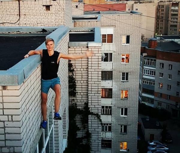 Andrey Retrovsky hanging from the top of a building in Vologda, Russia moment before falling to his death. The 17-year-old was part of the Rooftoppers craze, where daredevils hang one-handed off the edge of tall structures to take selfies.