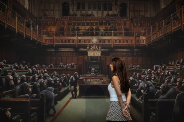 Sotheby’s staff pose for a photograph with Banksy’s ‘Devolved Parliament’ which has an estimated value of 1.5-2 million British pounds in a forthcoming sale in London, Britain September 27, 2019. REUTERS/Simon Dawson