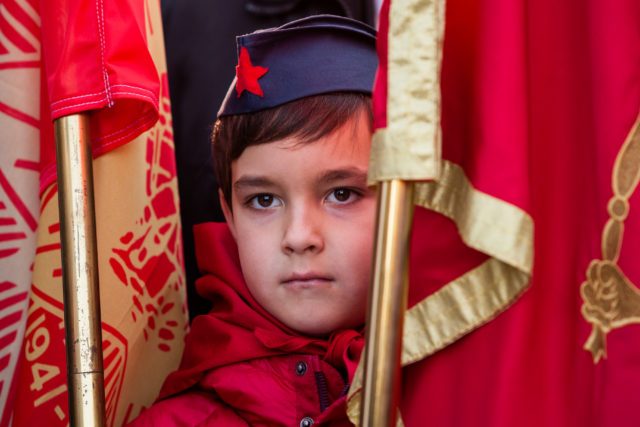 A boy wearing pioneer hat stand between flag poles during unveiling ceremony of the monument to the late Yugoslav leader Josip Broz Tito in Podgorica, Montenegro, December 19, 2018. REUTERS/Stevo Vasiljevic