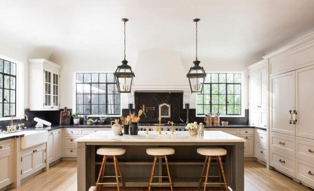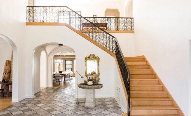 NateBerkus_HPSold14Impeccably restored to maintain architectural grandeur and integrity and expensively updated to integrate modern-day creature comforts such as state of the art home automation and security systems, a backup generator and a grey water recycling system, the mansion’s double-height foyer has 17th-century marble floor tiles and gives way to ample, wood-floored formal living and dining rooms, the former with a fireplace between gigantic arched windows and the latter with a baronial, intricately detailed plaster ceiling treatment. There’s also a paneled library, a second dining room for less formal occasions, a high-end farmhouse-inspired kitchen fitted with a sophisticated mix of black and white marble countertops and a family room that does double duty as a screening room with black out shades.