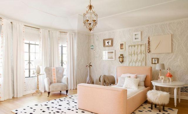 NateBerkus_HPSold8Four en suite guest bedrooms on the second floor are joined by a sumptuously outfitted master suite that opens out to a private terrace overlooking the backyard and includes a double walk-in closet/dressing room and a soignée bathroom where delicate, monochromatic landscape wall murals are authoritatively juxtaposed against a glass-enclosed shower sheathed in muscular, bookmatched slabs of richly veined marble.