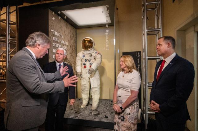 U.S. Vice President Mike Pence attends an unveiling of Neil Armstrong’s Pressure Suit, A7-L, Apollo 11, that he wore to walk on the moon July 20, 1969, with Rick Armstrong (L), son of Neil Armstrong, Dr. Ellen Stofan, The John and Adrienne Mars Director of the National Air and Space Museum, and James Bridenstine, Administrator of NASA, at the National Air and Space Museum in Washington, U.S., July 16, 2019. Smithsonian Air and Space Museum/Jim Preston/Handout via REUTERS.