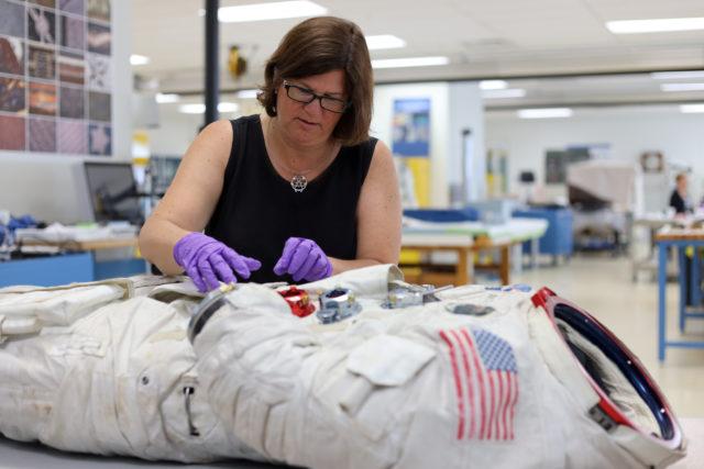 Lisa Young, objects conservator at the SmithsonianÕs National Air and Space Museum, makes an adjustment on Neil Armstrong’s pressure suit that he wore to walk on the moon during the Apollo 11 mission on July 20, 1969, at the Air and Space Museum’s Udvar-Hazy Center in Chantilly, Virginia, U.S., June 26, 2019. Picture taken June 26, 2019. REUTERS/Kevin Fogarty