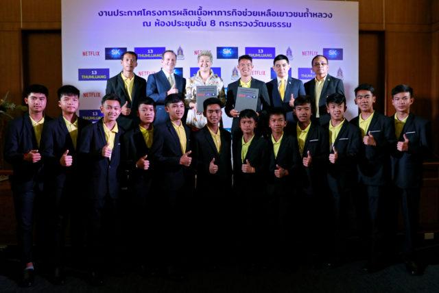 12 boys and their soccer coach who were stuck in a cave in northern Thailand last year and officials from Netflix pose for photo in Bangkok, Thailand April 30, 2019. REUTERS/Soe Zeya Tun
