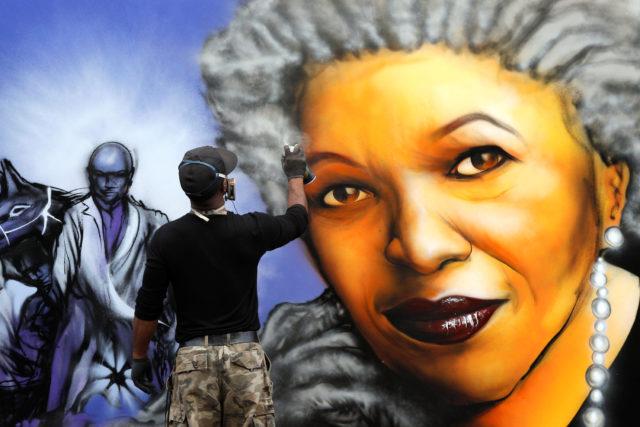 FILE PHOTO: An artist completes a wall painting depicting Nobel-winning U.S. novelist Toni Morrison attends the unveiling ceremony of a memorial bench marking the abolition of slavery in Paris November 5, 2010. REUTERS/Benoit Tessier/File Photo