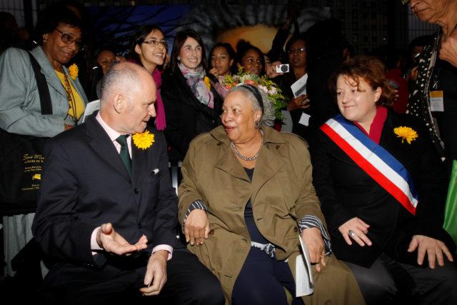FILE PHOTO: Nobel-winning U.S. novelist Toni Morrison (C) speaks with Christophe Caresh as she attends the unveiling ceremony of a memorial bench marking the abolition of slavery in Paris November 5, 2010 . REUTERS/Benoit Tessier/File Photo