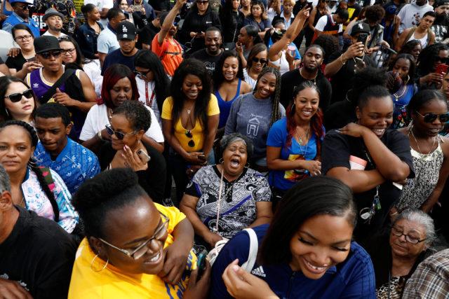 Fans fill the intersection while waiting for the funeral procession, following a memorial for rapper Nipsey Hussle, at Slauson Avenue and Crenshaw Blvd in Los Angeles, California, U.S., April 11, 2019. REUTERS/Patrick T. Fallon