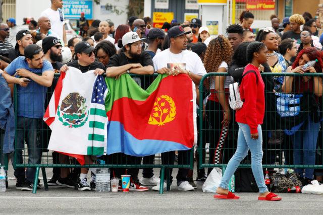 Fans wait for the funeral procession, following a memorial for rapper Nipsey Hussle, along Slauson Avenue in Los Angeles, California, April 11, 2019. REUTERS/Patrick T. Fallon