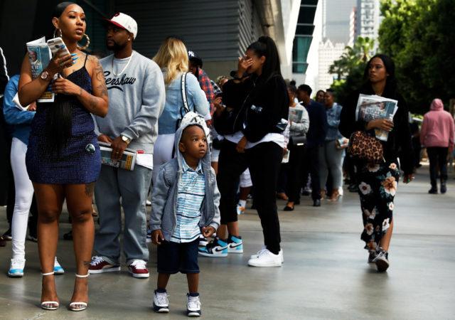 Mourners line up at Staples Center ahead of a memorial for rapper Nipsey Hussle in Los Angeles, California, April 11, 2019. REUTERS/Patrick T. Fallon