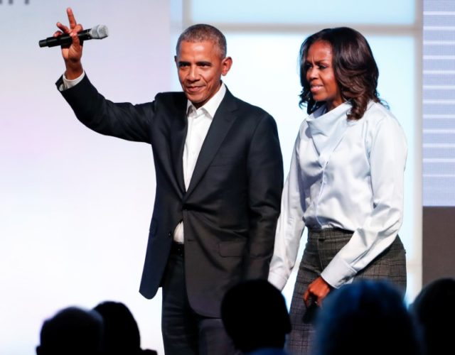 FILE PHOTO: Former U.S. President Barack Obama and former first lady Michelle Obama greet guests during the first day of the Obama Foundation Summit in Chicago, Illinois, U.S. October 31, 2017. REUTERS/Kamil Krzaczynski