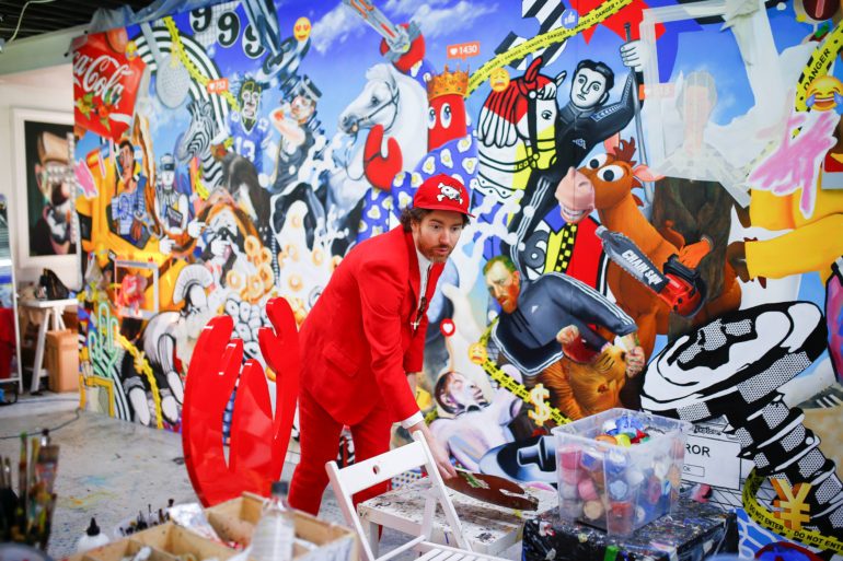 Scottish born Colbert, who has worked across music, fashion and design, says his large-scale oil paintings interweave art history references with Internet and social media images, such as emojis and like buttons, in bright cartoon-like collages featuring his lobster alter-ego.