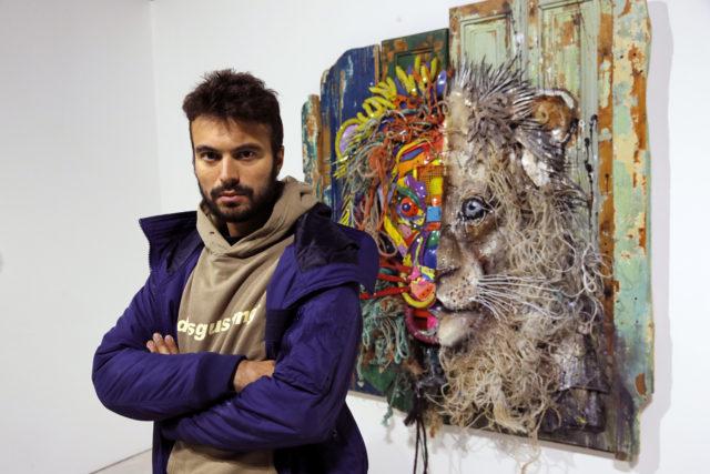 Street artist Bordalo II poses next to one of his creation “Half Lion” (2018) prior to the opening of his exhibition in Paris, France, January 22, 2019.REUTERS/Philippe Wojazer