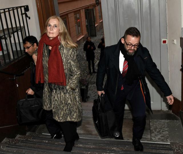 The member of the Swedish Academy and wife of Frenchman Jean-Claude Arnault, Katarina Frostenson (C), arrives to the Svea Hovratt appeal court together with laywer Bjorn Hurtig (R) and counsel Samuel Hartman (L) on the third day of Arnault’s appeal trial in Stockholm, Sweden, November 14, 2018. Jonas Ekstromer/TT News Agency/via REUTERS