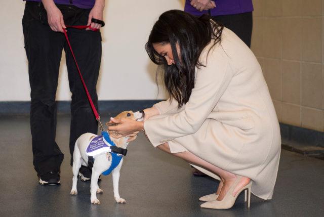 Meghan, Duchess of Sussex meets “Minnie” during a visit to the animal welfare charity Mayhew in London, Britain, January 16, 2019. Eddie Mulholland/Pool via REUTERS
