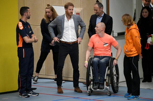 Britain’s Prince Harry talks with an athlete during the official launch of the one year countdown to the Invictus Games The Hague 2020, in The Hague, Netherlands, May 9, 2019. REUTERS/Piroschka Van De Wouw