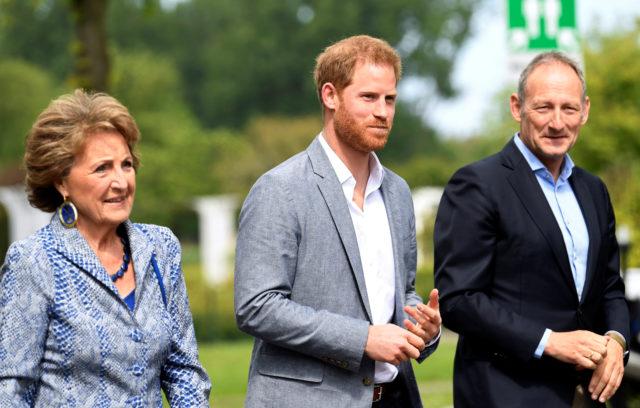 Britain’s Prince Harry, walks with Princess Margriet of the Netherlands and Invictus Games The Hague 2020 Chairman, Mart de Kruif, during the official launch of the one year countdown to the games, in The Hague, Netherlands, May 9, 2019. REUTERS/Piroschka Van De Wouw