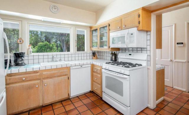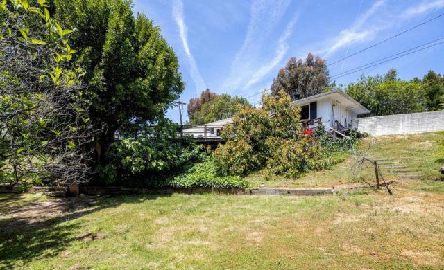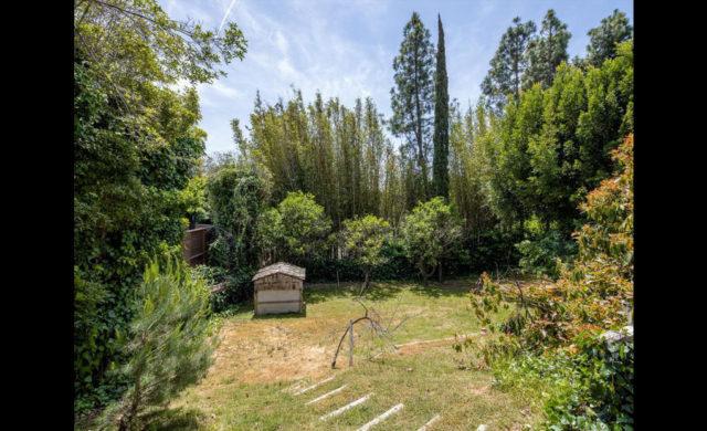 Although the house will likely be radically re-imagined or, even more likely, razed and replaced with a considerably larger spread, the existing living room has minty-green wall-to-wall carpeting and a black marble fireplace, the all-but worn-out kitchen has hardworking, white ceramic tile counters and the family room features a vaulted ceiling with exposed beams. French doors open several rooms to a concrete patio and classic, kidney-shaped swimming pool alongside a deck that hovers just above a short slope of bedraggled lawn surrounded by an untamed thicket of trees and shrubs.