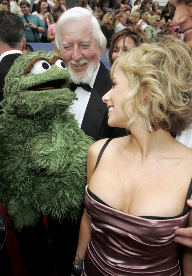 FILE PHOTO: Actress Jamie Foley (R) greets Caroll Spinney, the puppeteer and voice of muppet characters on TV’s Sesame Street and “Oscar the Grouch” as they arrive at the 33rd annual Daytime Emmy Awards in Hollywood, California, U.S., April 28, 2006. REUTERS/Fred Prouser/File Photo
