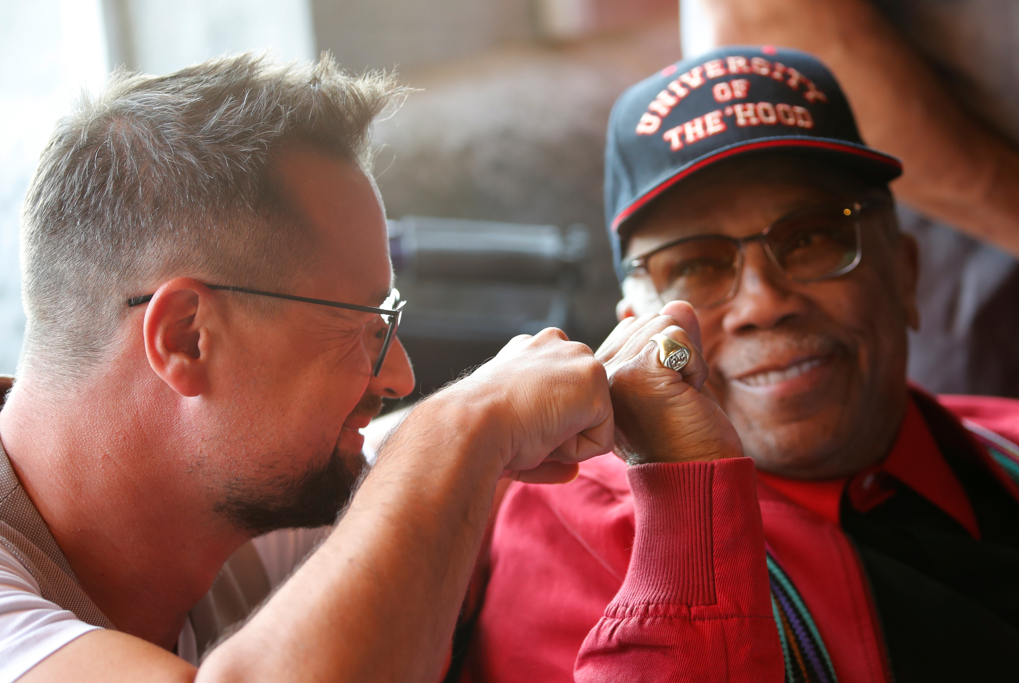 “My soul is smiling,” he said, sporting a blue baseball cap marked ‘University of the Hood’, while seated after being escorted into the room in a wheelchair.