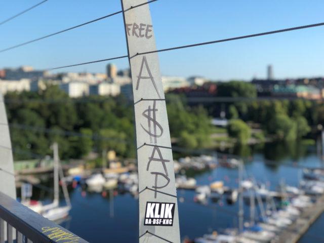 Graffiti asking for ASAP Rocky to be freed is seen in Stockholm, where American rapper is being held over charges of assault in Stockholm, Sweden, July 25, 2019. Johan Ahlander/REUTERS