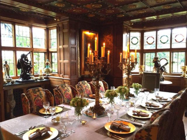 A grandiose foyer with handsome carved wood staircase leads to a 30-foot long drawing room with an elaborately detailed plaster ceiling and a carved stone fireplace with an over-mantel that dates to the early 1600’s. A smaller sitting room makes for more cozy gatherings and the baronial dining room features a gold-leafed ceiling and leaded glass bay windows with stained glass inserts.