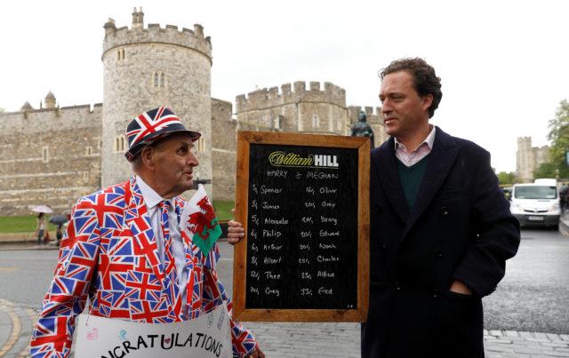Royal fan Terry Hutt stands next to Rupert Adams from William Hill as he holds a board with the possible names for Britain’s Prince Harry and Meghan, Duchess of Sussex, baby son, outside Windsor Castle, in Windsor, Britain May 8, 2019. REUTERS/Peter Nicholls