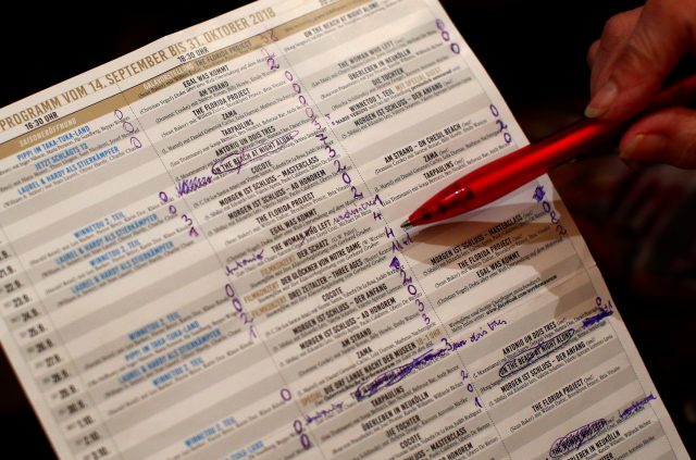 Cinema owner Anna Nitsch-Fitz, 80, uses a pen to point to the number of visitors written onto the monthly movie programme of Breitenseer Lichtspiele cinema in Vienna, Austria, October 11, 2018. REUTERS/Lisi Niesner