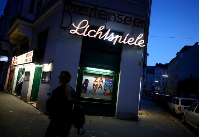 Projectionist Wolfgang comes out the entrance door as a woman walks in front of Breitenseer Lichtspiele cinema in Vienna, Austria, October 11, 2018. REUTERS/Lisi Niesner