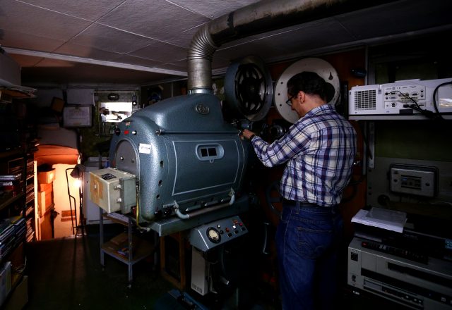 Projectionist Wolfgang demonstrates an analogue film projector in the screening room of Breitenseer Lichtspiele cinema in Vienna, Austria, October 11, 2018. REUTERS/Lisi Niesner