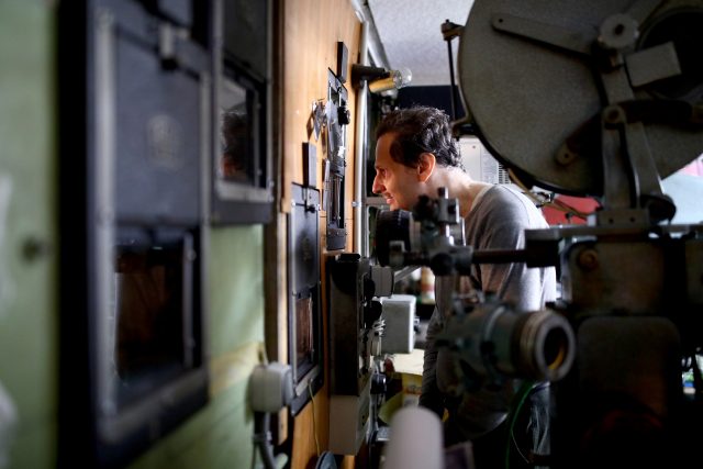 Projectionist Wolfgang looks through a window into the cinema hall at the screening room of Breitenseer Lichtspiele cinema in Vienna, Austria, November 8, 2018. REUTERS/Lisi Niesner
