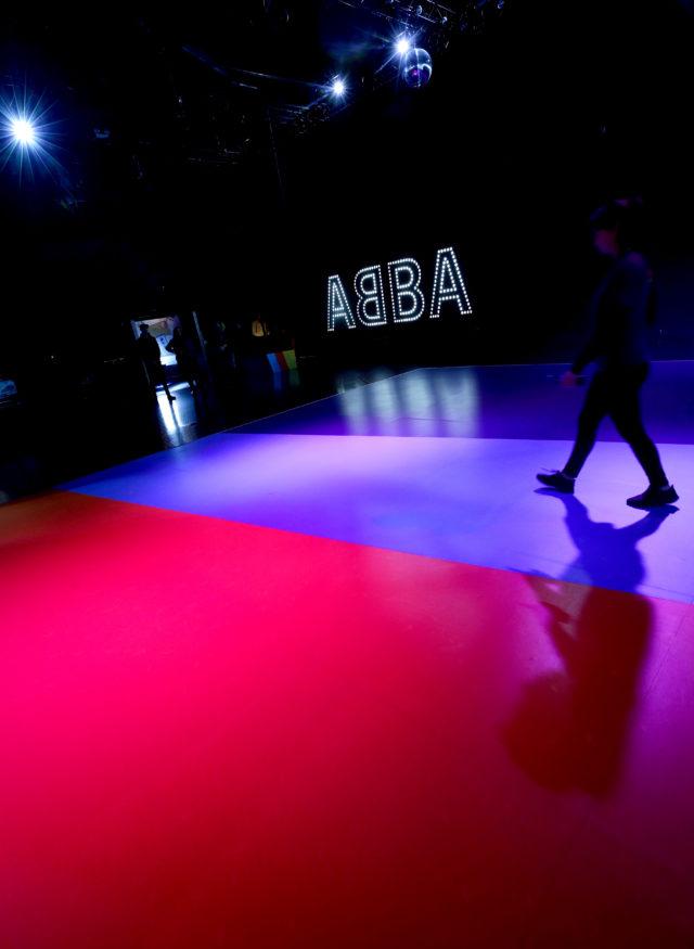 A staff member walks in front of an ABBA neon sign during the ABBA: Super Troupers The Exhibition at the O2 in London, Britain, December 5, 2019. REUTERS/Lisi Niesner