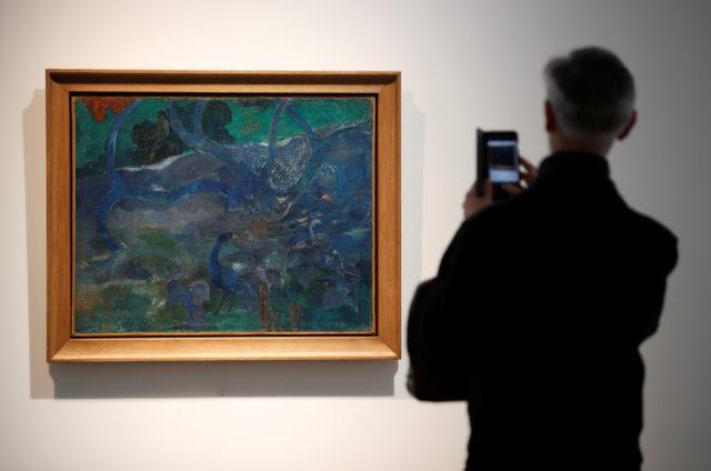 FILE PHOTO: A man takes a picture of Paul Gaugin’s “Te Bourao II” (The Purao Tree) painting (1897) at Artcurial’s auction house in Paris, France, October 3, 2019. REUTERS/ Christian Hartmann