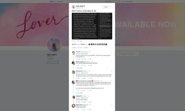 A tweet from Taylor Swift’s Twitter account is seen on a computer screen after being posted on November 14, 2019. @taylorswift13/Twitter.com/via REUTERS