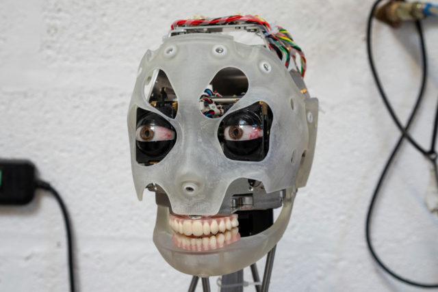 The head of Ai-Da, a humanoid robot capable of drawing people from life using her bionic eyes and hand, is seen in the offices of robotics company Engineered Arts, in Falmouth, Cornwall, Britain February 7, 2019. Picture taken February 7, 2019. REUTERS/Matthew Stock