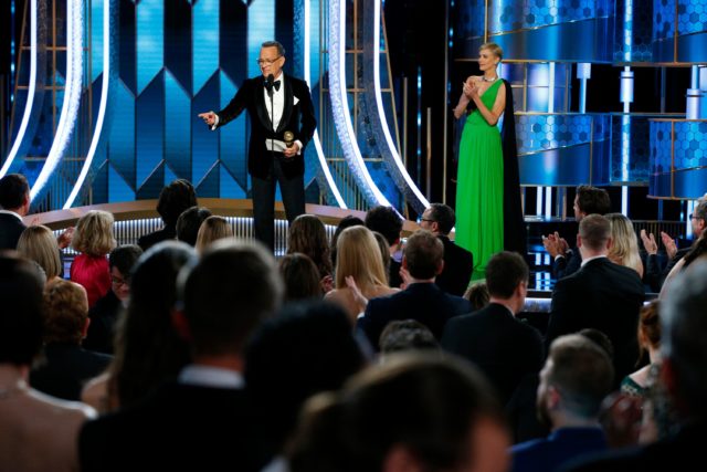 77th Golden Globe Awards – Show – Beverly Hills, California, U.S., January 5, 2020 – Tom Hanks accepts the Cecil B. DeMille Award as Charlize Theron looks on. Paul Drinkwater/NBC Universal/Handout via REUTERS