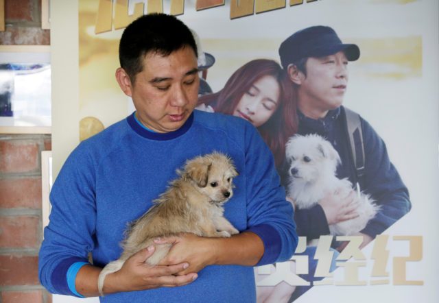 Owner He Jun poses with a two-month-old clone of his dog Juice next to a movie poster showing source dog Juice, at his pet resort in Beijing, China November 21, 2018. Picture taken November 21, 2018. REUTERS/Jason Lee