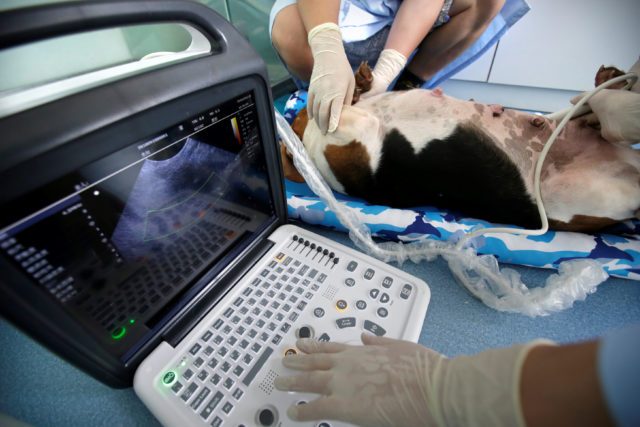 Veterinary doctors conduct a pregnancy test on Beagle dog NTR1917, the surrogate mother of a clone of the dog Juice, at the biotech company Sinogene in Beijing, China September 10, 2018. Picture taken September 10, 2018. REUTERS/Jason Lee