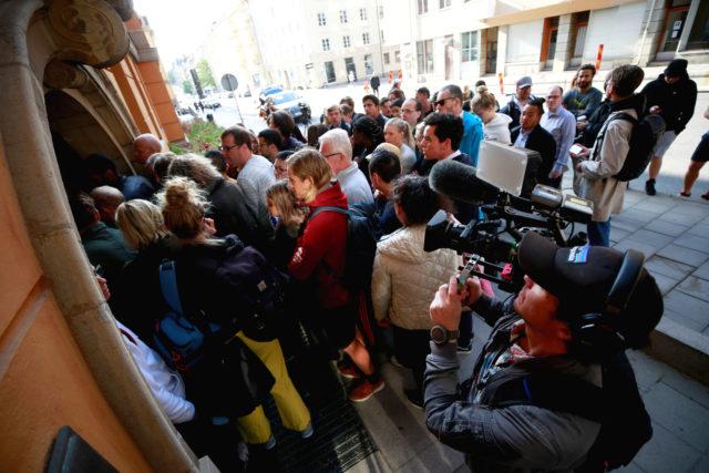 Journalists work outside the district court, during the second day of ASAP Rocky’s trial, in Stockholm, Sweden August 1, 2019. TT News Agency/Fredrik Persson via REUTERS
